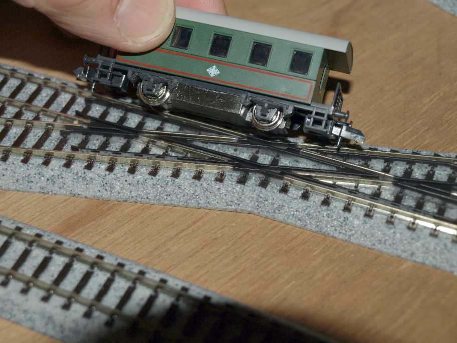 列車もレールもKATOです。だったら列車の方にだけでも『交差線路は通過出来ません。』位の表示が有っても極当たり前って思うのは僕だけでしょうか?