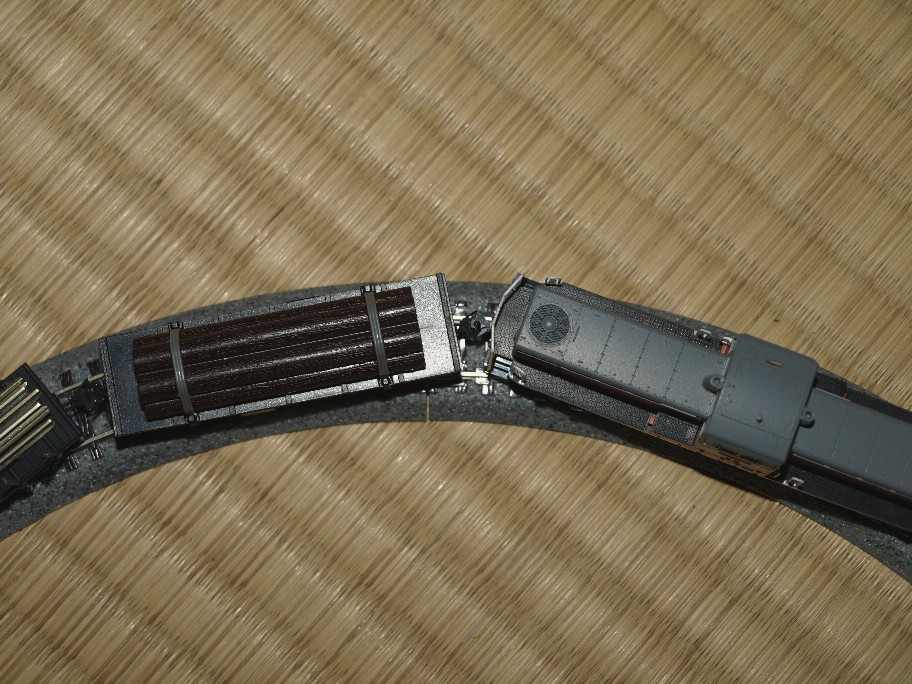 引っ張る貨車はカプラーの左右の動きが鈍い(殆ど出来ない)相手(僕の改造ミスです、原因は判っているので直しますけど、この様なテストには好都合)。