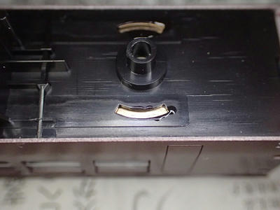 車体側の接点。円弧を描いていますので判りますよね。台車の接点はカーブを通過する度に左右に振れて円弧を描きます。