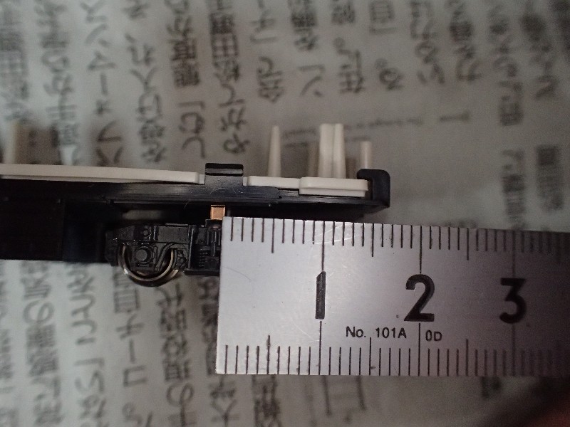 続いて室内灯の導電板の根元と台車中心の距離を測定(殆ど変わらなく12~13mmです)。