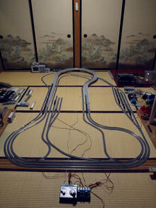 先のレールを撤去して、とりあえずセットしたのは極普通のオーバルコース(高架複線は押入れの中)。色々と実験するのに最低のレールを作ったのです。