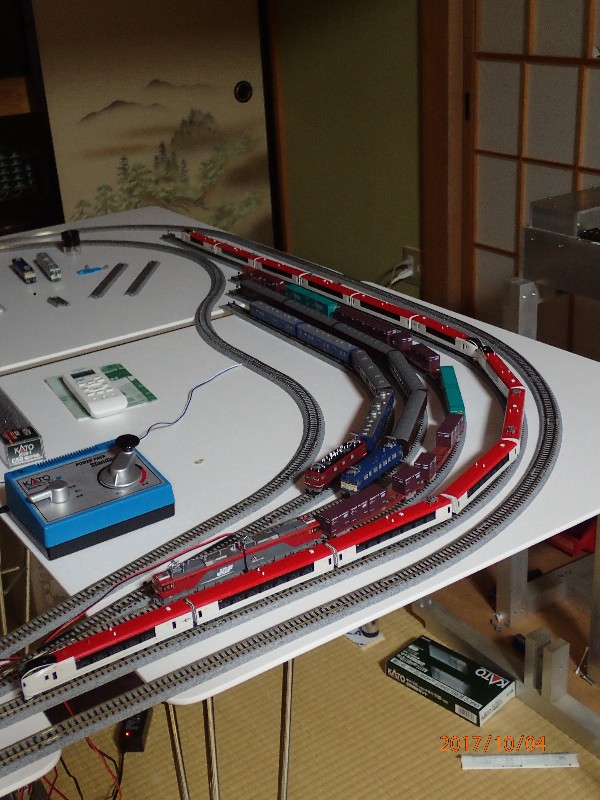 今回の12両編成。今のレールレイアウトですと一直線になれる場所が無い(直線レールが短い)。