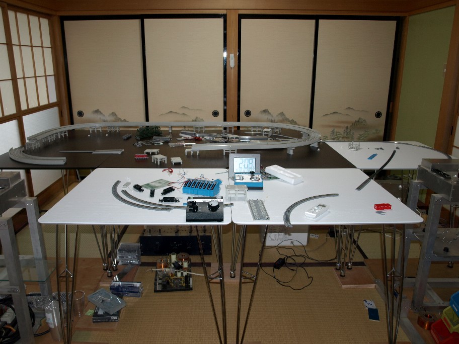 少しでも広い面積が欲しく、最後は食事用のテーブルとNゲージのテーブルを交換するという・・・・・(食事のテーブル、狭くなった。汗)。
