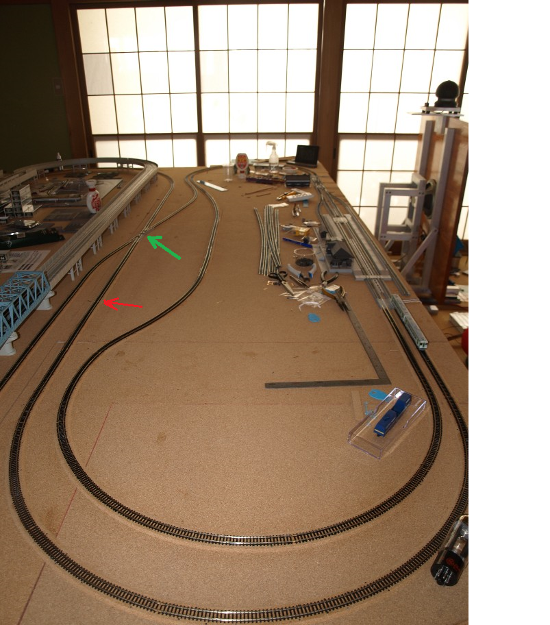 で、大事なのが緑矢印の交差線路。実際には有り得ないので立体交差へ変更します(今はとりあえずのレールです)。