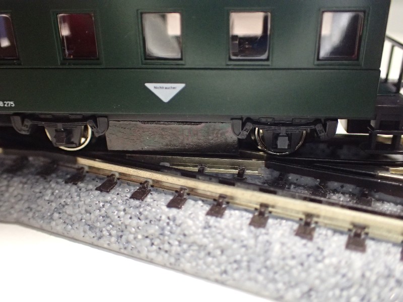 Nゲージは、左右の線路から電気を供給されて走行します。レールの黒い部分はプラスチック製。つまり電気を供給出来ないんですね。