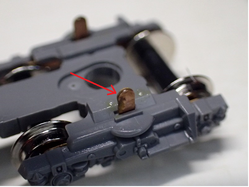 台車側の赤矢印部分。此の先端が溝の中に入って、車体側の導電板と接します。