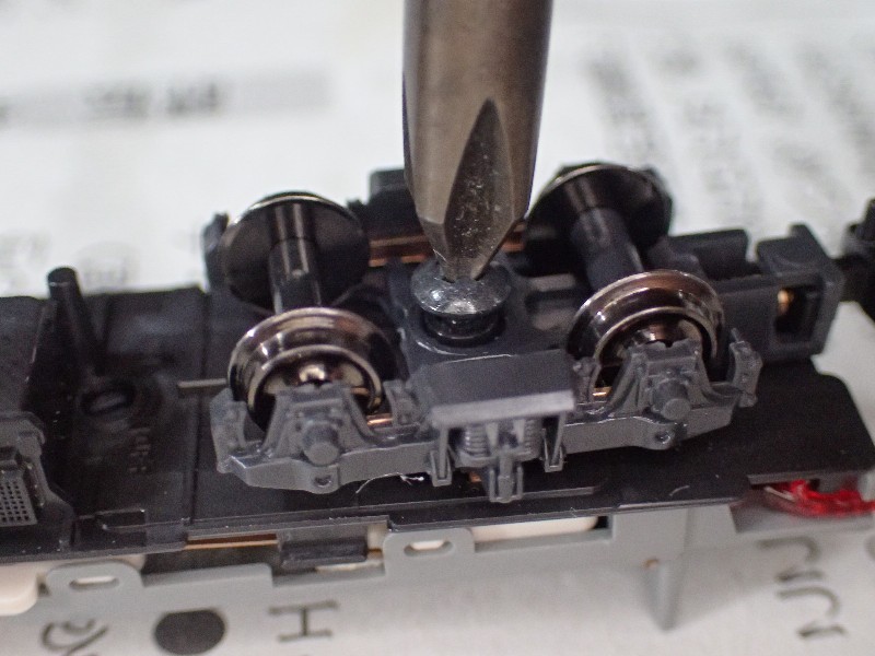 室内灯のちらつきの一番の元凶(僕はそう思っています)、台車を外します(その序でにカプラーも交換)。