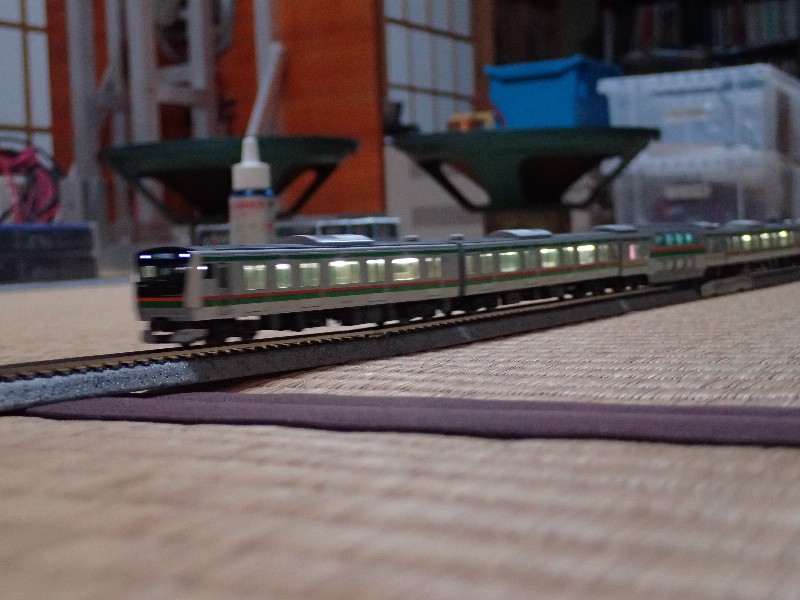 組んで直ぐの車両。室内灯が僅かのウインク。