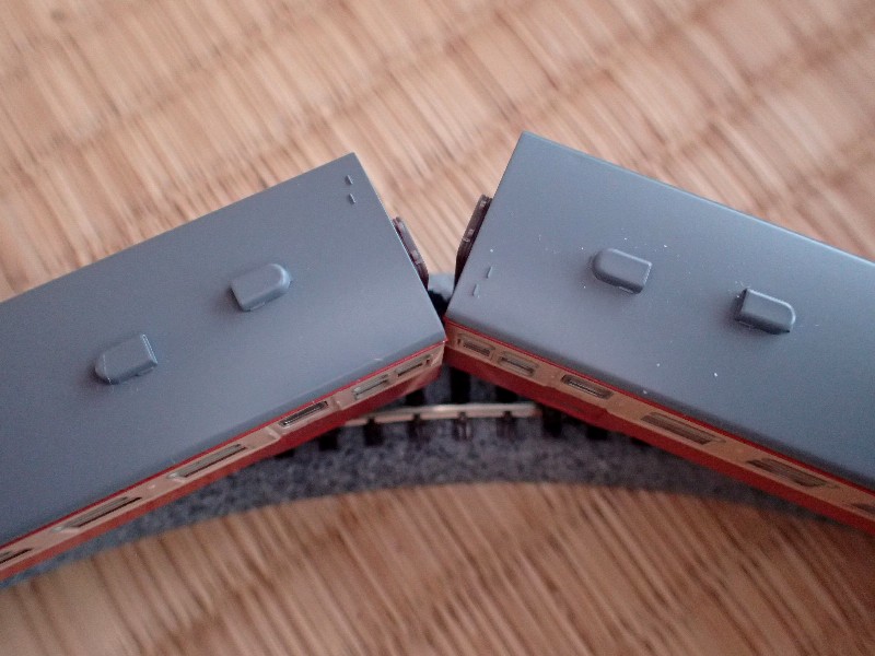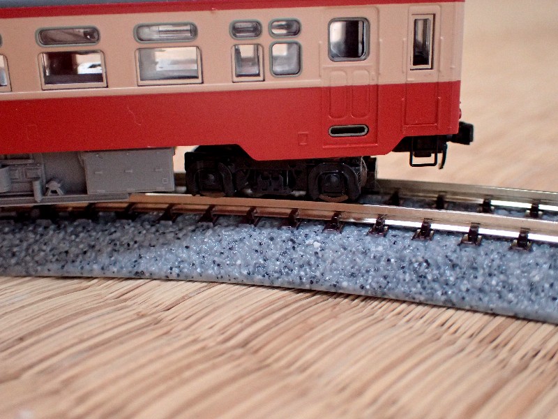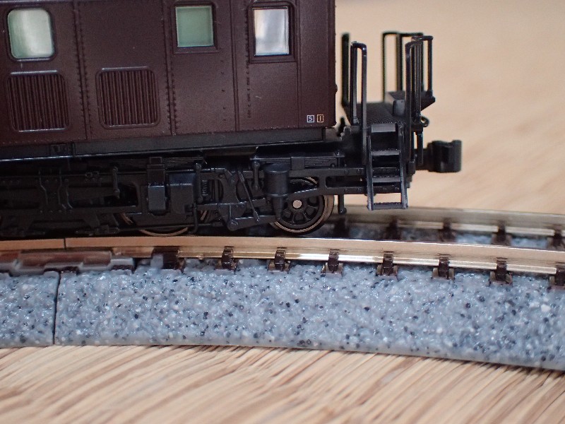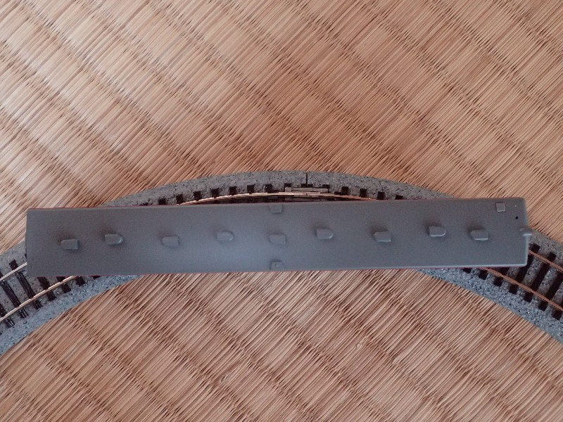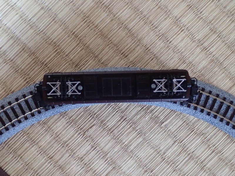 先輪もギリギリで脱線していません。何周も回らせましたが不安定な挙動はゼロ(また一両増えた、ニコッ)。