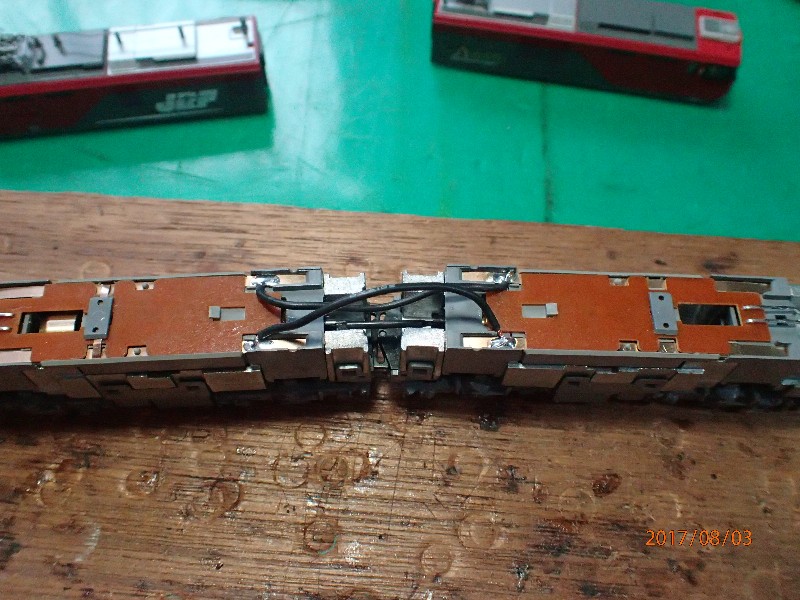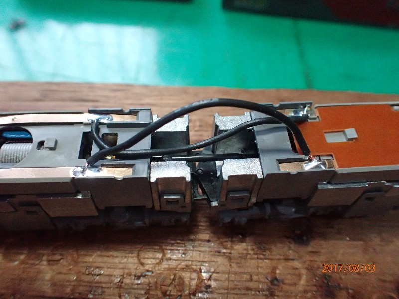 其方の車両とモーター車両の導電板を配線で繋ぐ事にしました。