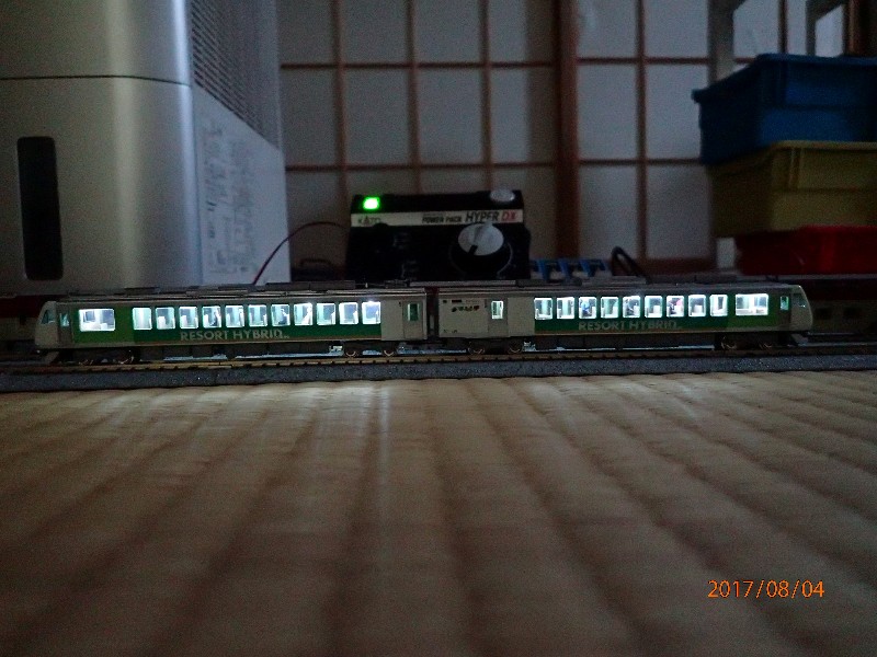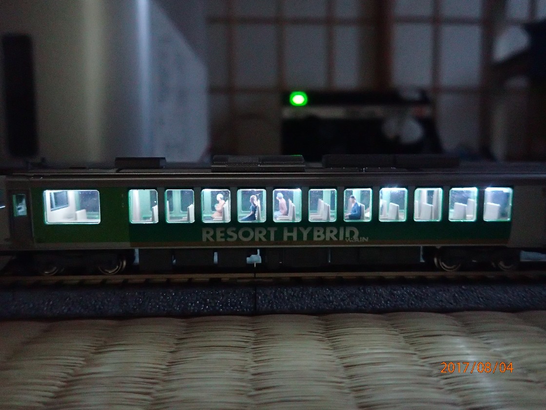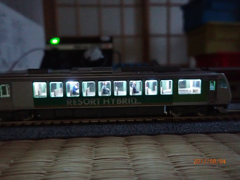 椅子の向きが其々の車両の先頭の方を向いているので、後ろの車両の人形は進行方向反対側を向いてしまって・・・・・(KATOさん、もうチョイ考えてよ)。